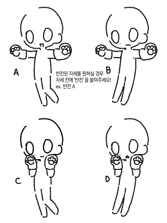 ex. 자세, 방향▶ A캐릭터: D 왼쪽 / B캐릭터: 반전A 오른쪽에 배치해서 서로 등지게 해주세요.